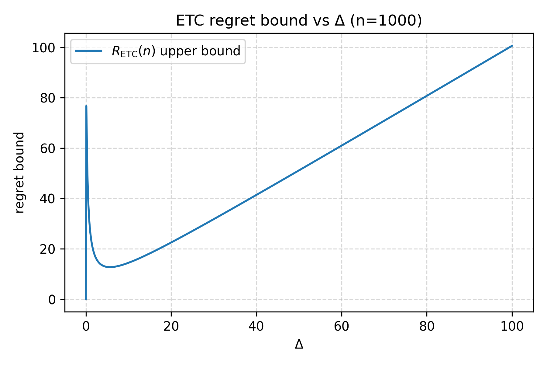 Note that $m \ge 1$, and $R_{\operatorname{ETC}(m)} (n)$ cannot exceed $n\Delta$ as discussed above. Informally, this bound says that, for fixed gap $\Delta$, the regret of ETC grows only logarithmically with the horizon $n$, but with a relatively large constant and the need to know (or tune around) $\Delta$ to choose $m$.