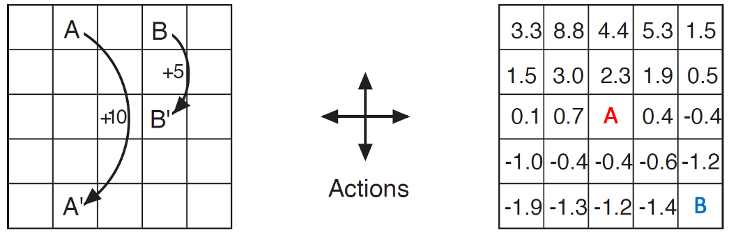 Cells with number have given values. The arrows on the left indicate the reward for each move. Hitting a wall yields a reward of $-1$ and the agent remains in the same position. All other moves yield zero rewards. Actions are chosen uniformly at random. $\gamma = 0.9$.
